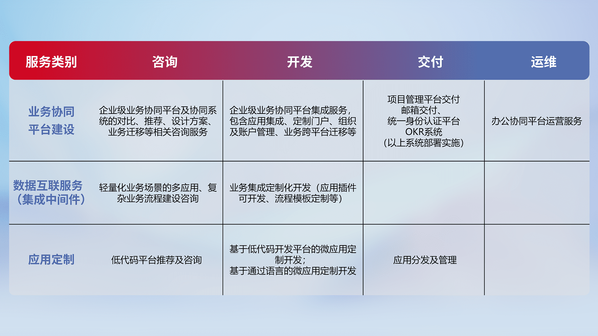 针对钉钉、、、企微、、、IDaas等平台级产品提供产品的规划、、方案、、交付、、、定制化开发等服务,,,,实现如统一协同办公、、智能客户服务、、、混合会议管理、、智能数据查询、、等业务场景,,,实现数字化转型。。