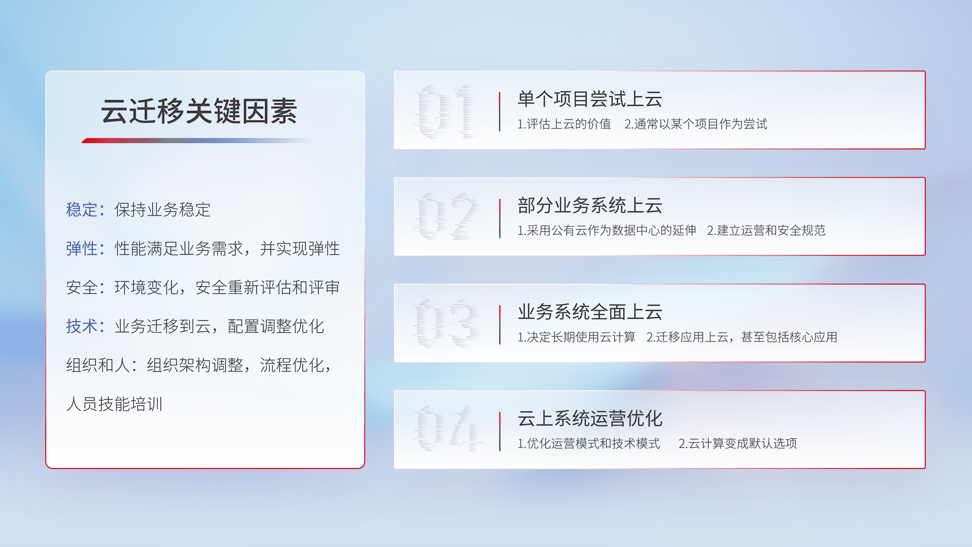 结合实际业务,,,从规划设计、、、、云平台选型、、、、云原生改造、、数据迁移、、、、集成交付,,迁移全过程为客户识别最佳上云路径,,,做好风险识别管理,,设计网络架构、、、身份权限、、、安全审计合规、、操作审计、、、日志审计、、、监控告警策略、、、多站点容灾设计等,,,对云上基础设施进行整体规划,,,提升IT治理水平,,,,以满足弹性、、、、高可用、、高性能的需求。。。