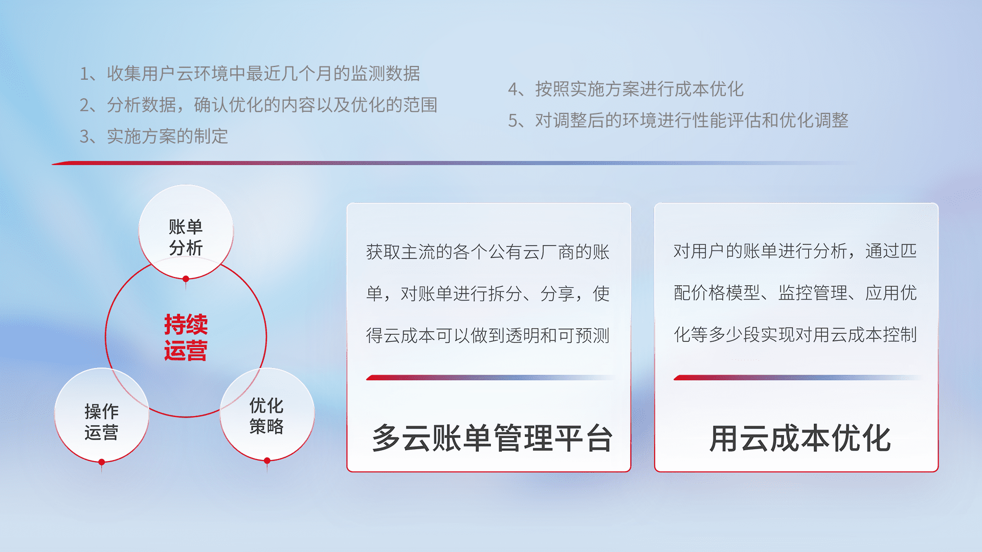 通过多云纳管,,,以统一的资源数据模型把客户的云资源进行抽象和封装,,,,进而实现对多云资源的统一操作,,,,保障云资源管理的可靠性、、、、稳定性与可用性。。量身定制化运维内容,,,配置、、开发运维、、、补丁管理、、备份、、监控、、认证和访问管理、、、审计和日常巡检等,,,,保障在用云过程中的可靠度,,,稳定度以及高可用率。。