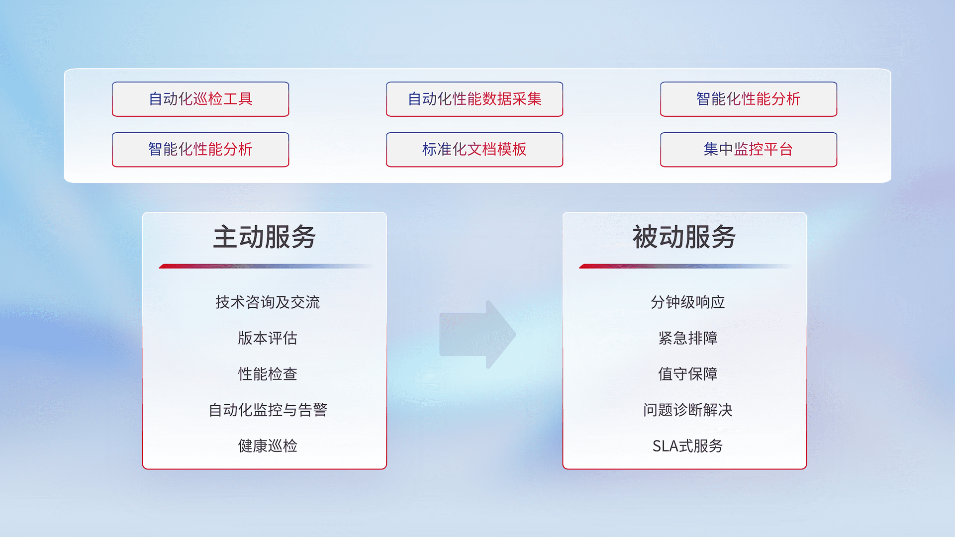 智能化工具和标准化文档,,,,保障服务质量,,提供主动服务(包含技术咨询、、、、版本评估、、、、性能检查、、、自动化监控与告警、、、、健康巡检)和被动服务包含(分钟级响应、、紧急排障、、、值守保障、、、问题诊断解决、、、、SLA服务)。。。。