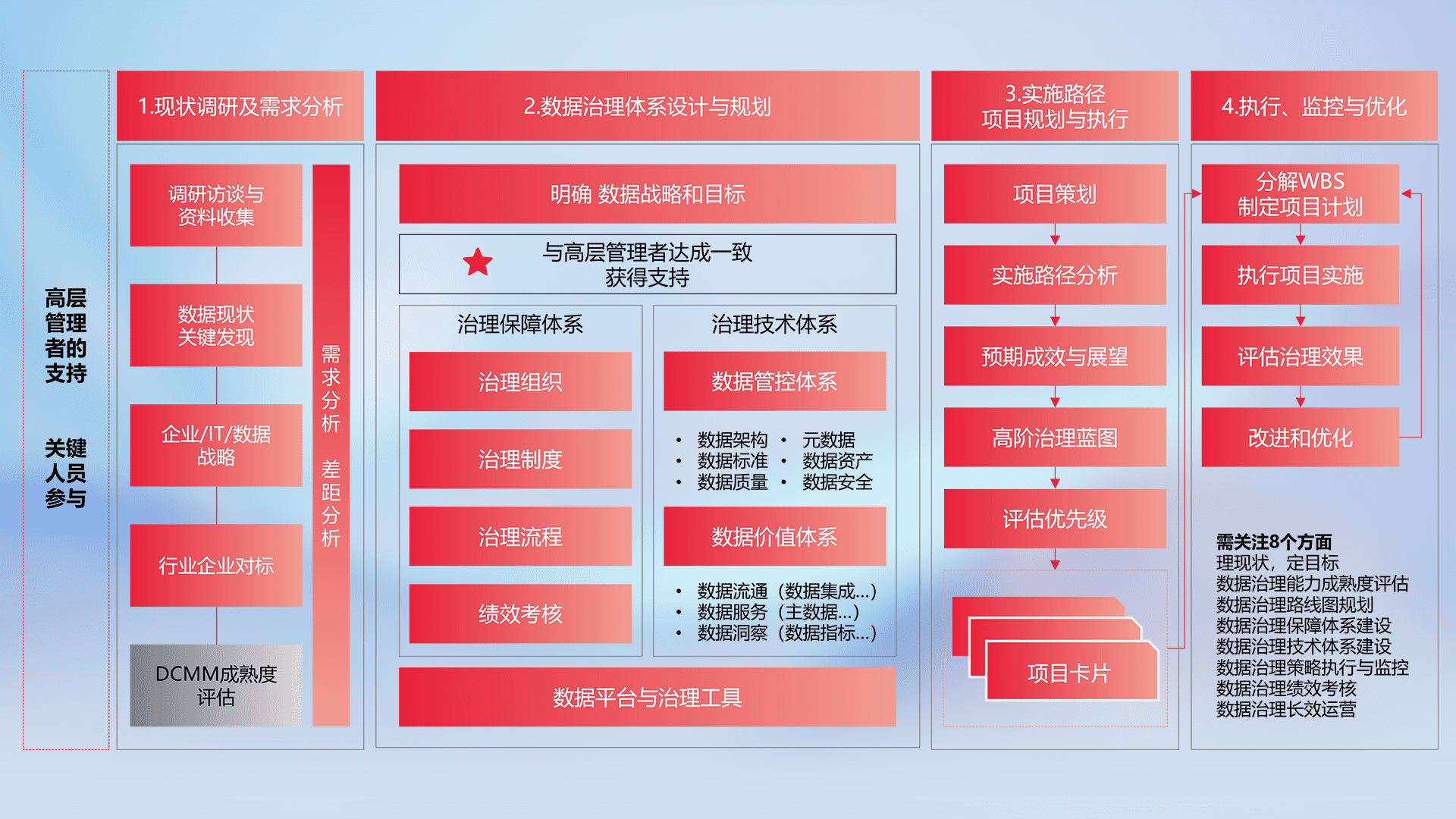 制定并执行统一的数据标准,,,规范数据定义和格式,,,,消除冗余和不一致性,,实现跨部门和跨系统的数据一致性,,,,为企业提供标准化的数据基础。。。。